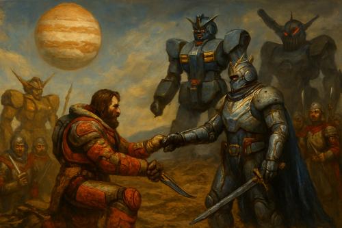 En tal tiempo se hallan los descendientes de Lord Tetsuo de Wagner y Vergara, caballero nombrado por el propio Arturo. Sus hijos sirven en el Bastión Excalibur III, orbitando Júpiter en lucha sin fin contra los bárbaros clanes que habitan sus lunas. Y he aquí que la saga se abre con la acometida final contra el Clan Arthax, señores de Adrastea, cuya fortaleza será asaltada por los herederos de la Casa Wagner y Vergara, en una batalla que decidirá si la gloria retorna o se extingue para siempre en el vacío estelar.